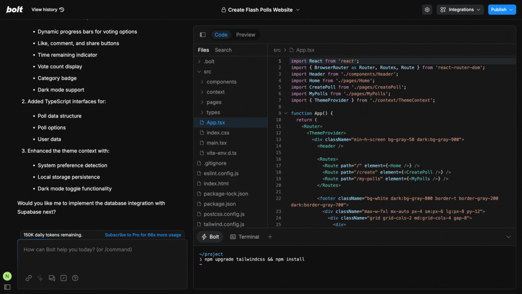 - Not just code generation—Bolt helps debug, refactor, and improve your project as you work.